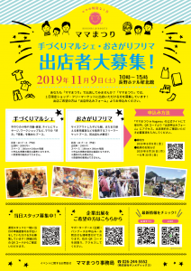 2019.7.1 【ママまつり】手づくりマルシェ・おさがりフリマ出店者募集! 2019.11.9(土)10時~15時 長野ホテル犀北館(長野市県町528-1) 手づくりマルシェ・おさがりフリマ出店者を募集します。 応募はこちらから。