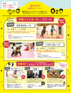2019.10.25 【ママまつり】事前予約受付中 2019.11.9(土)10時~15時 長野ホテル犀北館(長野市県町528-1) ママのママによるママのための「ママまつり」 今年は事前予約ができるコンテンツが登場! 事前予約をしてたくさんのイベントに参加しよう! ■ハイハイレース・カタカタレースのお申込みはこちらから ■セミナー&ワークショップのお申込みはこちらから ■特典がもらえる来場予約の方法はこちらから 詳細情報はママまつり公式HPでチェック≫